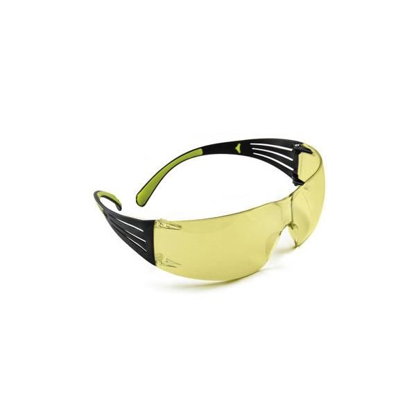 Skyddsglasögon med gul lins och beläggning mot repor och imma. Utrustad med mjuka, ultratunna skalmar för ökad komfort över öronen samt mjuka, justerbara näsbryggor.