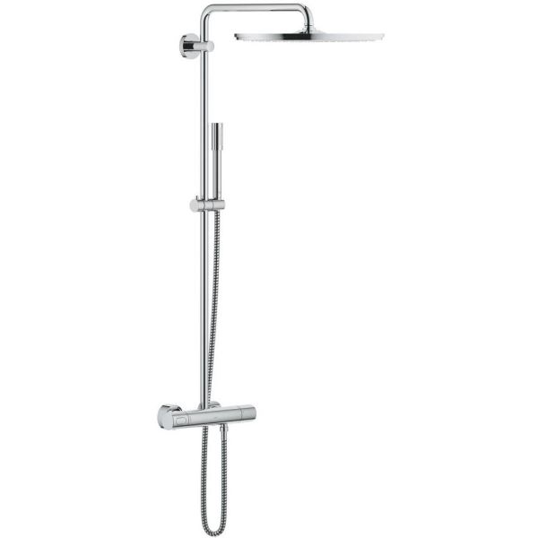 Rainshower System 400 duschsystem med termostatblandare för väggmontage. Duschsystemet består av: horisontellt svängbar duscharm (450 mm), termostatblandare (150 cc) med aquadimmer-funktion, takdusch Rainshower Cosmopolitan 400, handdusch Sena, reglage för höjd och duschslang Rotaflex Metal Longlife 1750 mm.