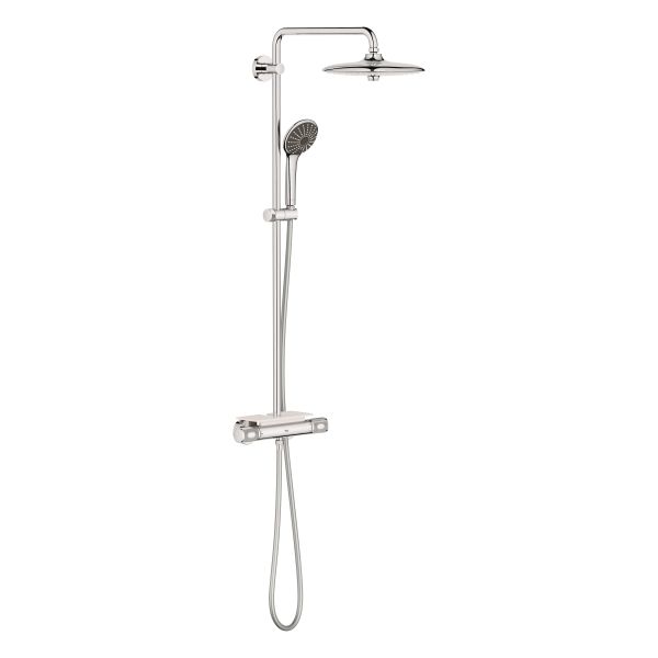 Grohe Vitalio System 260 är ett duschsystem med termostatblandare för väggmontering. Denna stilrena dusch låter dig välja mellan handdusch eller takdusch och tre olika stråltyper.