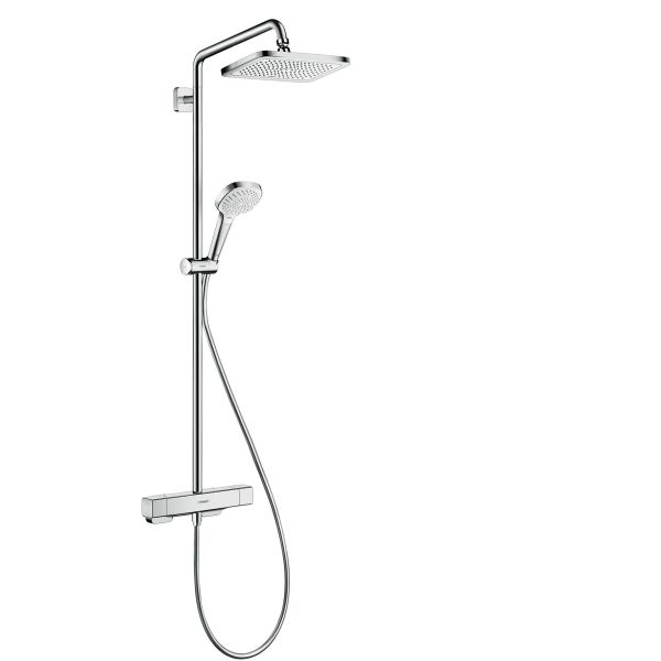 Hansgrohe Croma E280 1-Jet Showerpipe 160cc är ett kromat takduschset med huvuddusch, handdusch, duschtermostat, duschslang och glidfäste. Maximal flödesmängd vid 3 bar är 15,3 l/min och den har anslutningsgänga G ½.