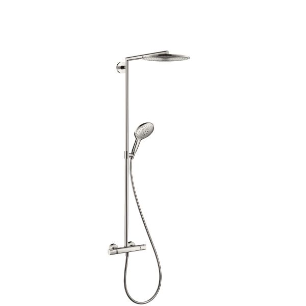 Takduschset bestående av huvuddusch, handdusch, duschtermostat, duschslang, glidfäste och duschstång.
