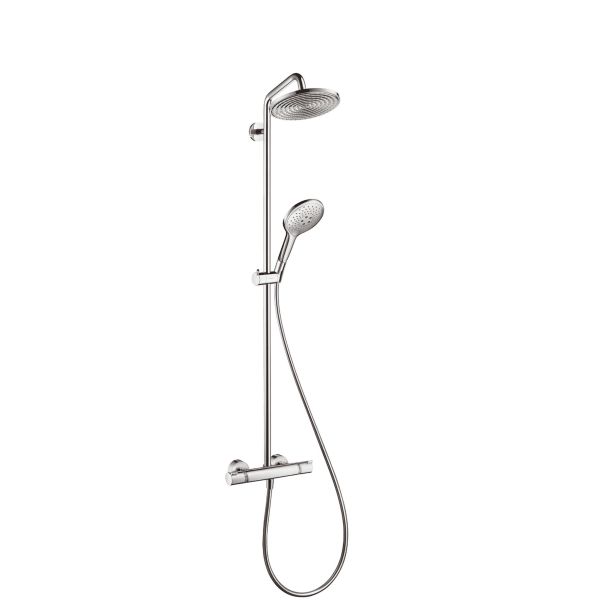 Hansgrohe Raindance Select S 240 takduschpaket bestående av huvuddusch, handdusch, duschblandare, duschslang, glidfäste och duschstång. Takduschen har en diamater på 236 mm och intällbar vinkel.