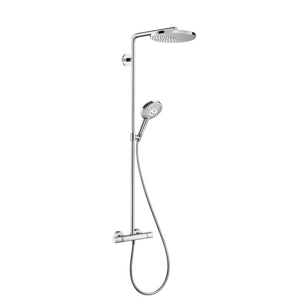Duschset bestående av huvuddusch, handdusch, duschtermostat, duschslang och glidfäste. Huvudduschen Raindance S 240 P har en diameter på 240 mm och en stråltyp, medan handduschen har tre stråltyper att välja mellan: Rain, PowderRain och Whirl.