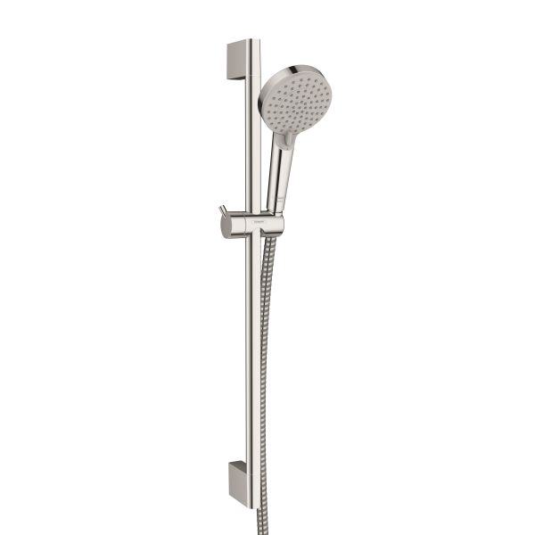 Duschset som innehåller handdusch, Crometta-duschstång på Ø22×650 mm, duschslang med dubbelsidig konisk mutter samt glidfäste. Handduschen har en duschhuvudstorlek på 100 mm och två stråltyper.