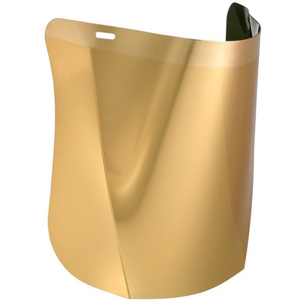 Guldpläterat visir i polykarbonat för användning med hörselskydd, hjälm och visirbärare för ett heltäckande skydd ovanför halsen. Reflekterar värme och skyddar mot infraröd strålning, smält metall och stänk från skadliga vätskor.