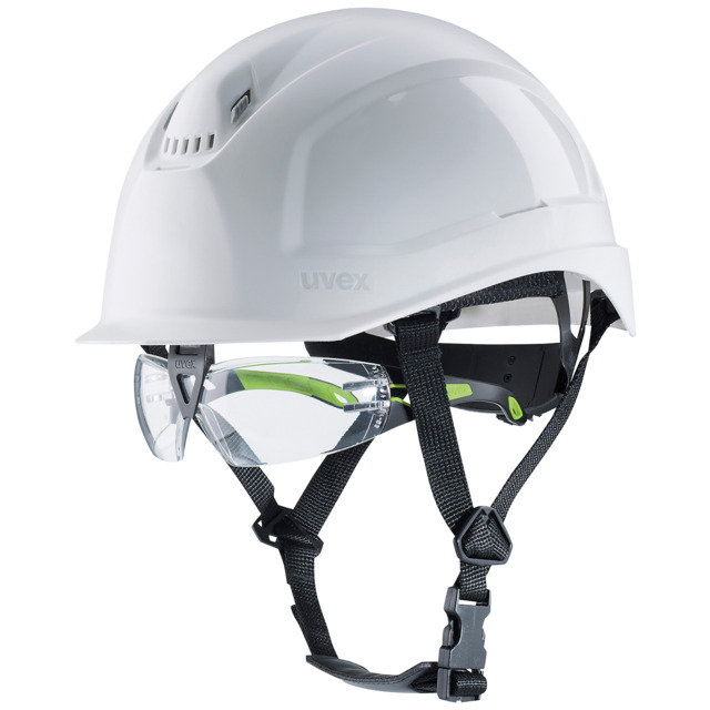 Skyddshjälm med justerbar passform och ventilationsöppningar. Kort brätte för bredare synfält uppåt. Pannlampsfäste och Euroslotadaptrar för hörselskydd. Levereras med skyddsglasögon.