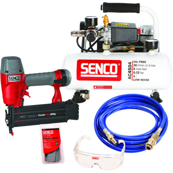 Startkit med kompressor, dyckertpistol, slang, dyckert och skyddsglasögon.