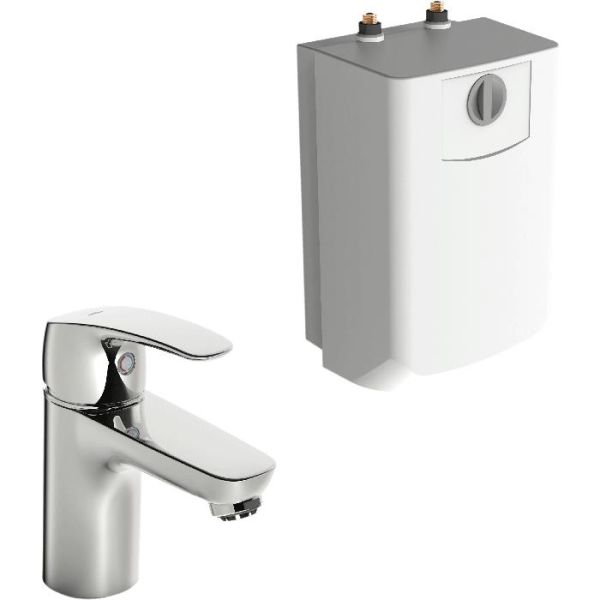 tvättställsblandare med en öppen 5 l varmvattenberedare. Blandaren har en fast utloppspip, strålblandare och ett flöde på 5 l/minut. Varmvattenberedaren har en volym på 5 l och får bara användas tillsammans med Oras speciella blandare för fritidshus.