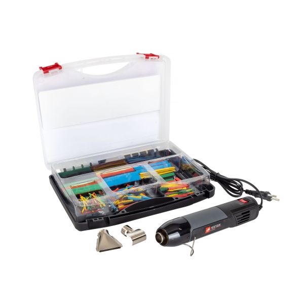 Pela 543834 är en varmluftspistol och krympslang i sats. Värmepistol med justerbar temperatur i två lägen.