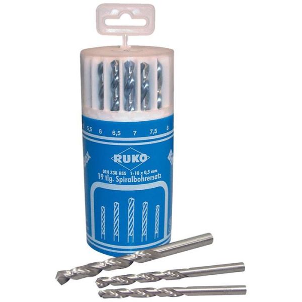 Borrbox med 19 stycken borrar i storlekarna 1-10 mm och medföljande 0,5 intervall i hel och halva dimensioner.