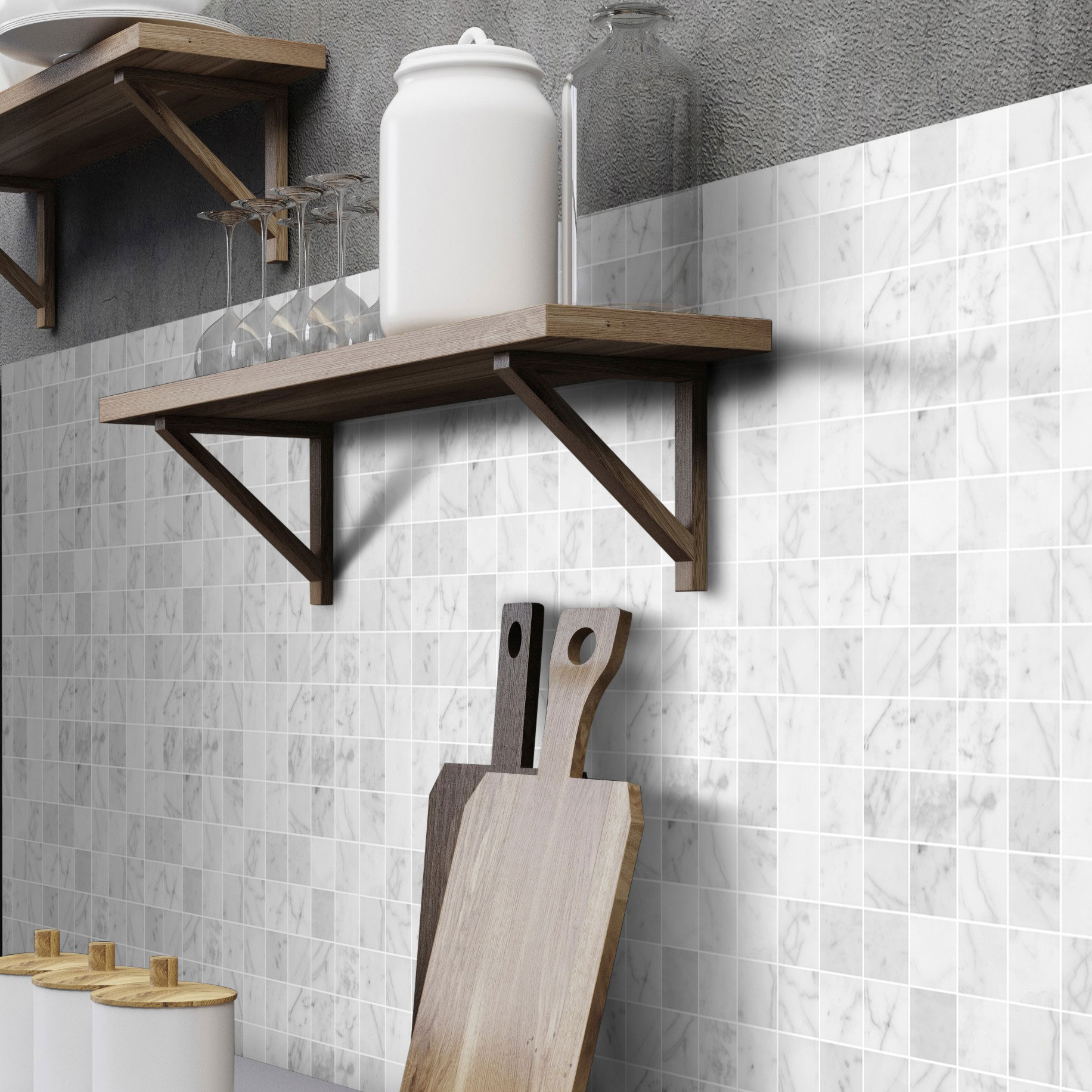 Mindre kvadratisk plattor i äkta carrara marmor som tål golvvärme och kan sättas på både golv och vägg inomhus.