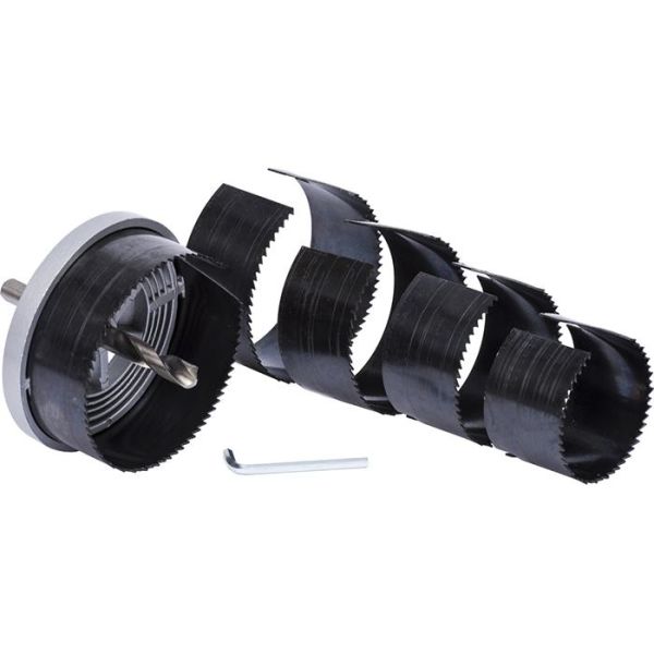 Hålsågset i 5 delar som passar till de flesta dosor. Sågbladen har dimensionerna Ø 60, 67, 74, 83 och 95 mm. Setet kan också användas till flera halogen- och LED-belysningar som ska byggas in. Levereras med en insexnyckel.