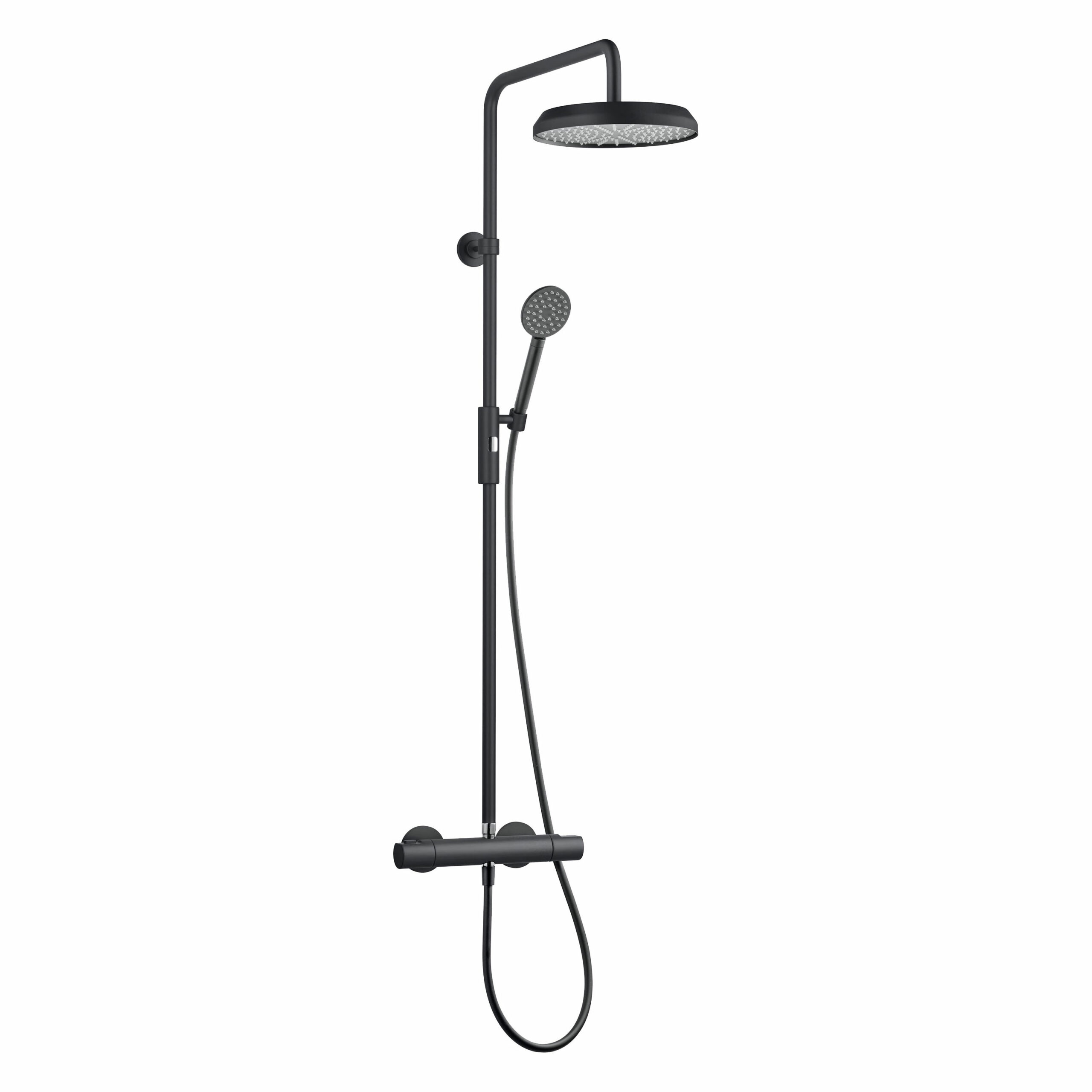 Takduschpaket med tryckbalanserad termostat och omkastare i vred. Duschröret ovanför väggfästet går att kapa efter önskad duschhöjd. 160cc. Kombineras med blandarfäste.
