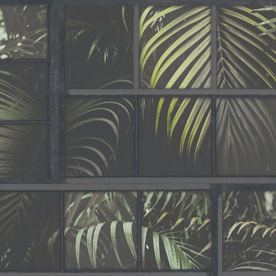 Tapet från Living Walls. Modern tapet i gröna och svarta toner som föreställer industrivägg med palmblad. Ytan på tapeten är i vinyl vilket gör att avtorkningsbarheten är hög.