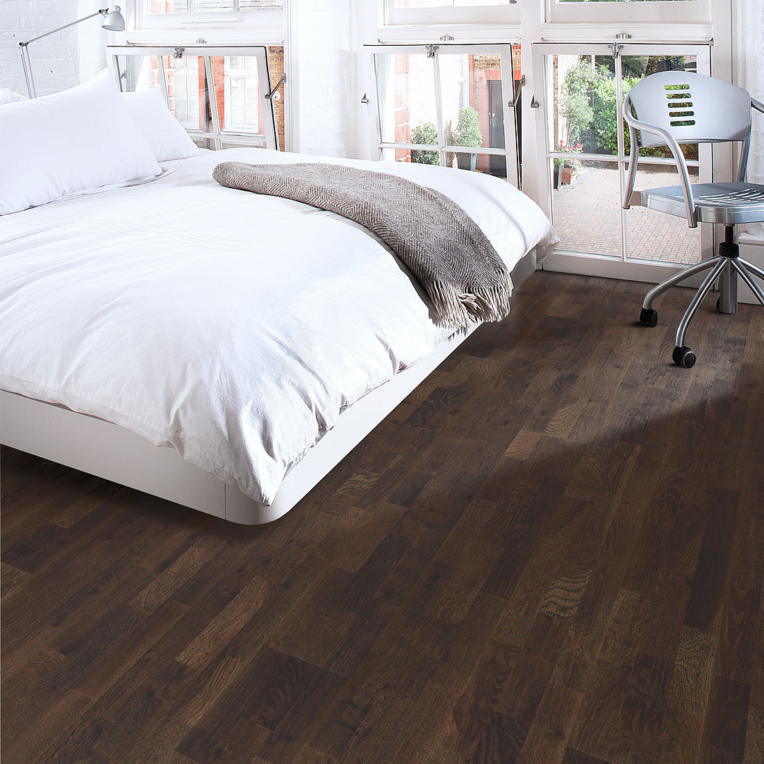 Trägolv Kährs Lava Mattlackad Borstad Svart Ek 3-stav är en ebenholtspigmenterad och mattlackad 3-stav med små färgvariationer. Golvet innehåller stora kvistar. Trägolv Kährs Lava Mattlackad Borstad…: