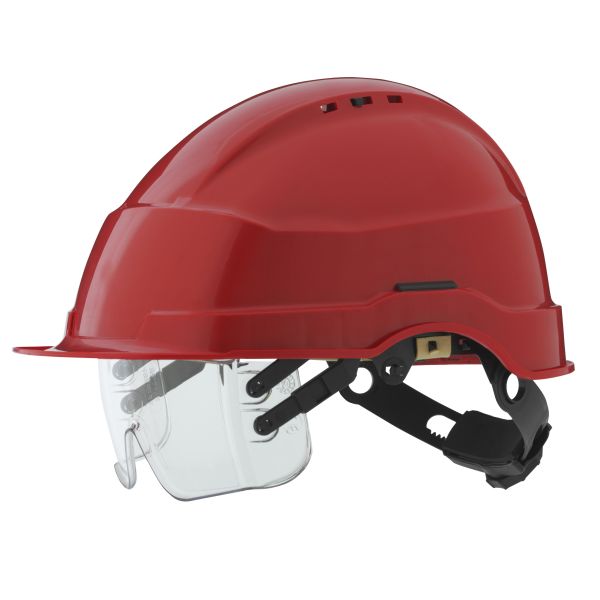 Skyddshjälm med integrerade skyddsglasögon av polykarbonat. Egna glasögon kan bäras under visiret.